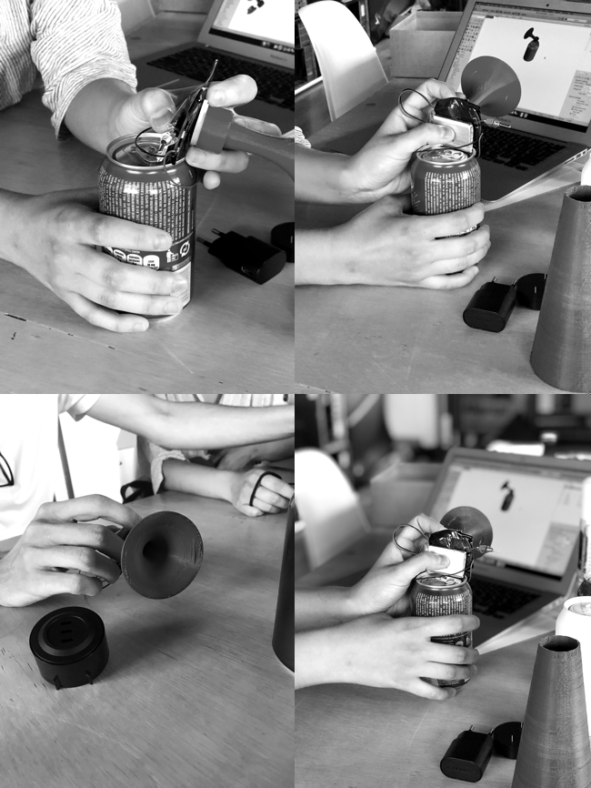 For the horn version, several usability and acoustic tests were carried out so that we could find the ideal shape to be attached to the can; a special lock was designed so the horn could be coupled under pressure in the can, without the need for holes or glue in the final version.
